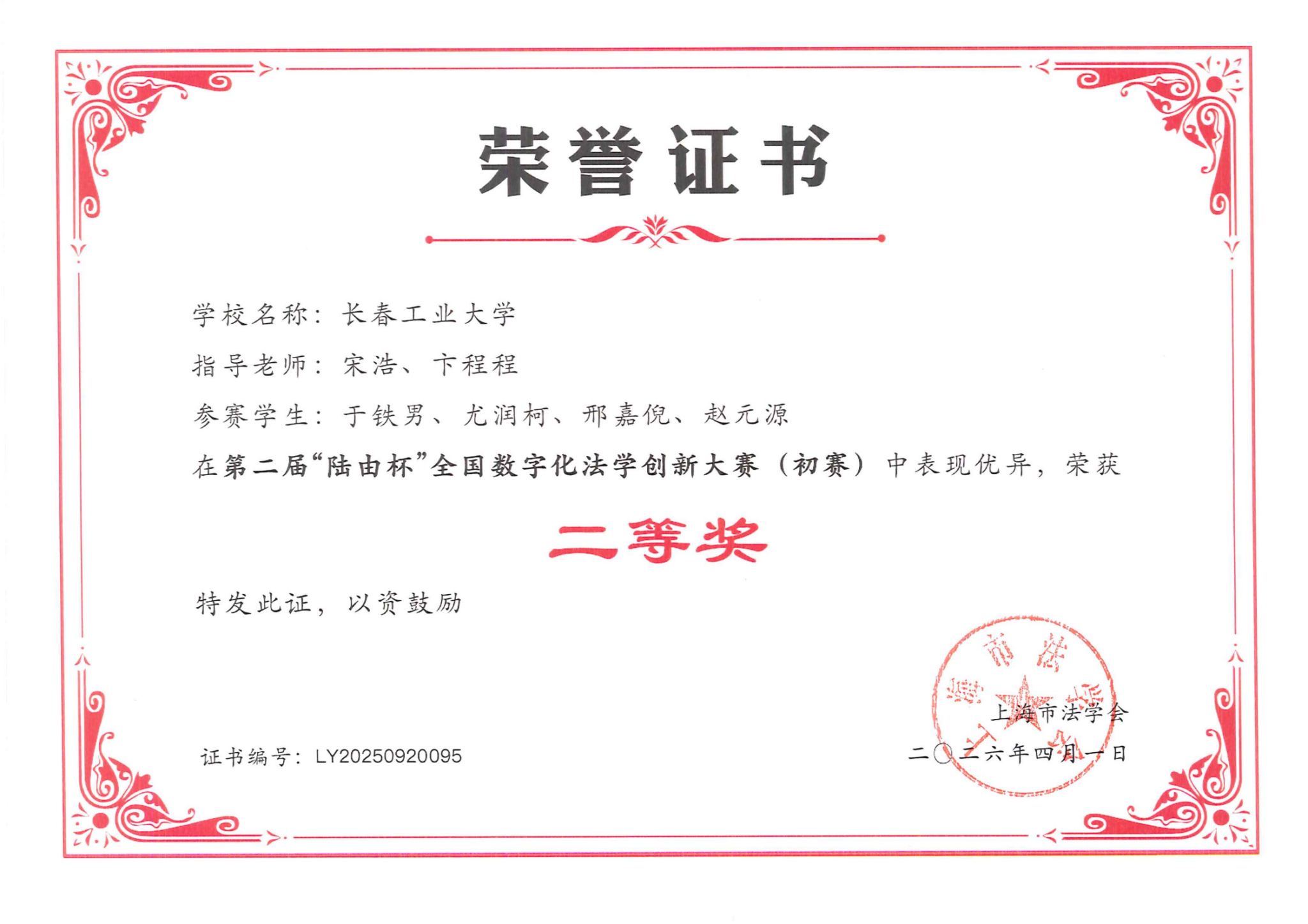 团队由宋浩、卞程程两位老师担任指导,成员包括于铁男、尤润柯、邢嘉倪、赵元源四位同学。在备赛过程中,团队紧扣数字化法学前沿趋势,结合法学理论与数字工具,提出具有创新性与可行性的解决方案,最终在初赛中脱颖而出,荣获二等奖。