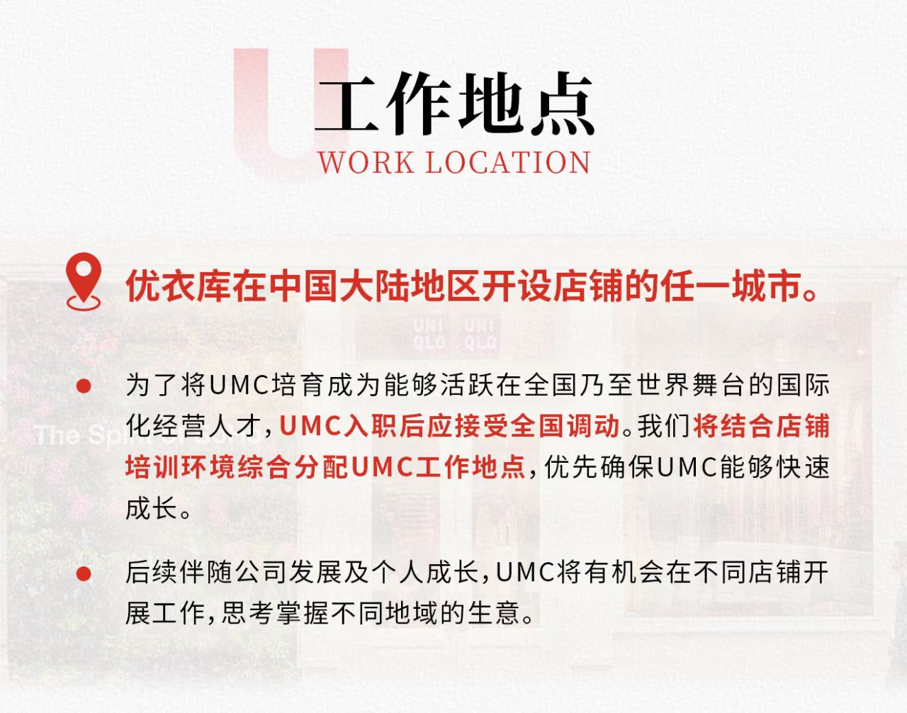 工作地点:优衣库在中国大陆地区开设店铺的任一城市